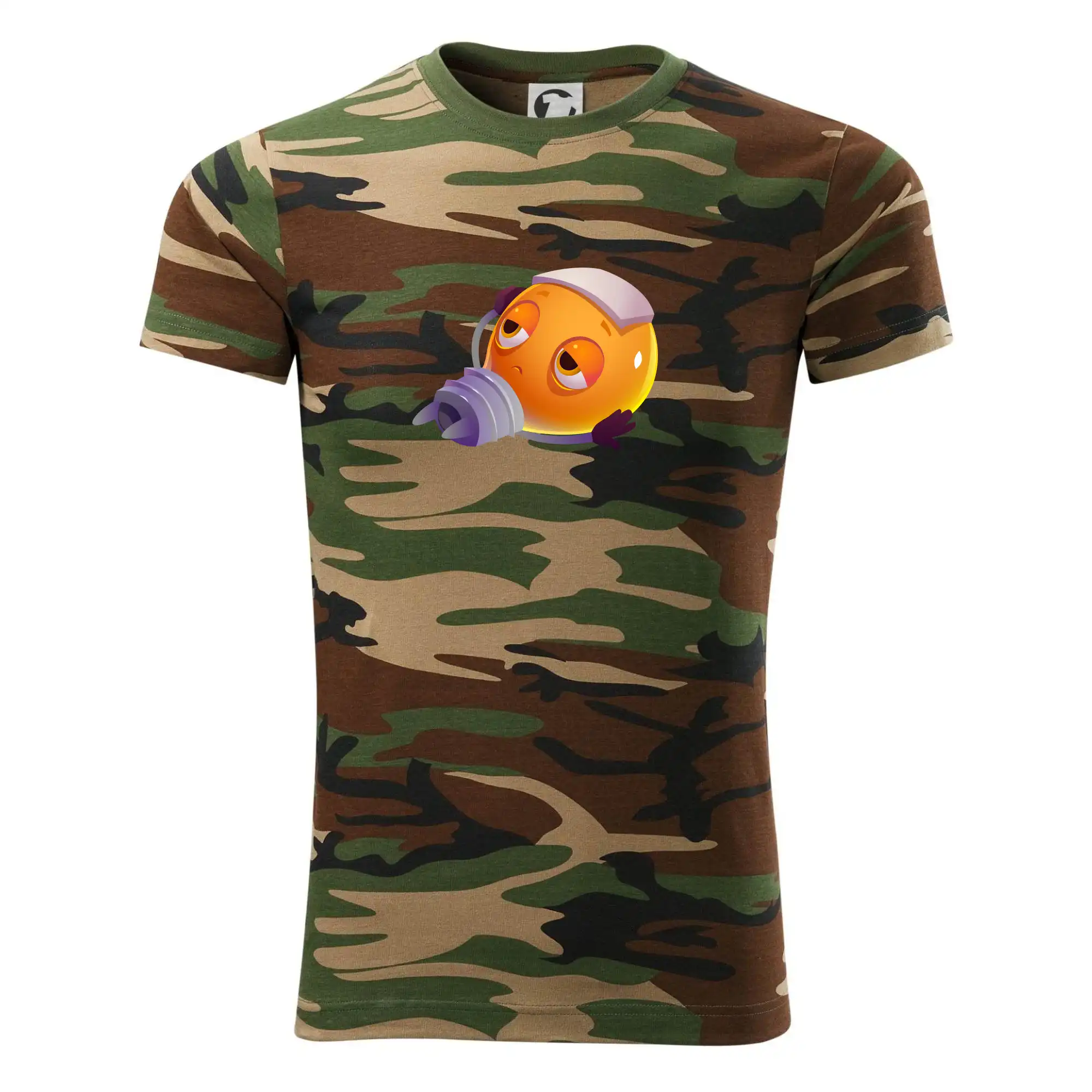 Tričko strednej gramáže vo farbách camouflage. Strih s bočnými švami. Lem priekrčníku z rebrového úpletu s prídavkom 5% elastanu. Vnútorná časť zadného priekrčníka začistená páskou vo farbe camouflage.