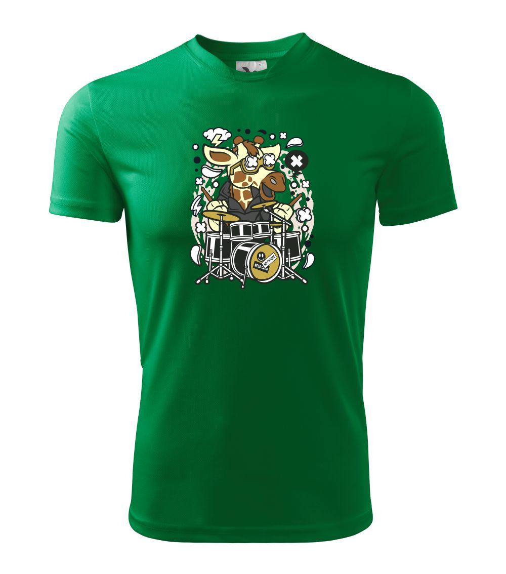 Tričko so žirafou, ktorá hrá na bicích, je vhodný darček pre bubeníka.
