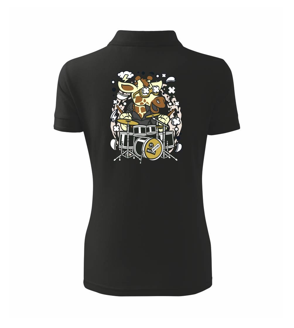 Tričko so žirafou, ktorá hrá na bicích, je vhodný darček pre bubeníka.