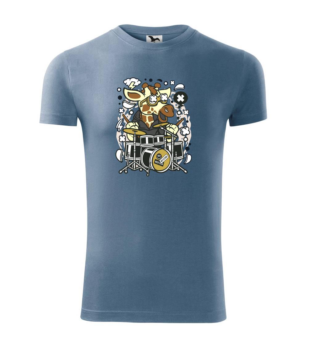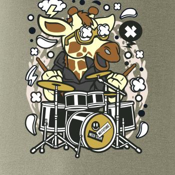 Tričko so žirafou, ktorá hrá na bicích, je vhodný darček pre bubeníka.