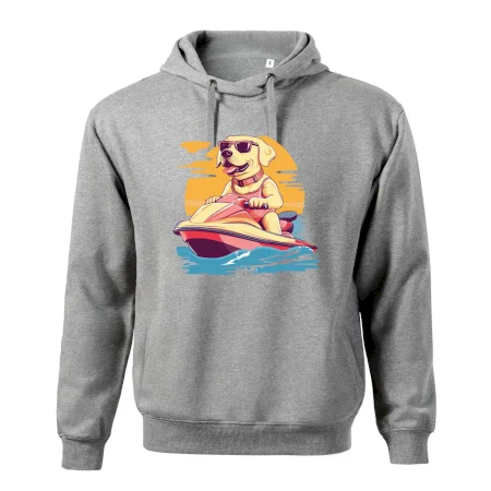 Zlatý retriever na vodnom skútri