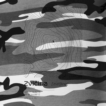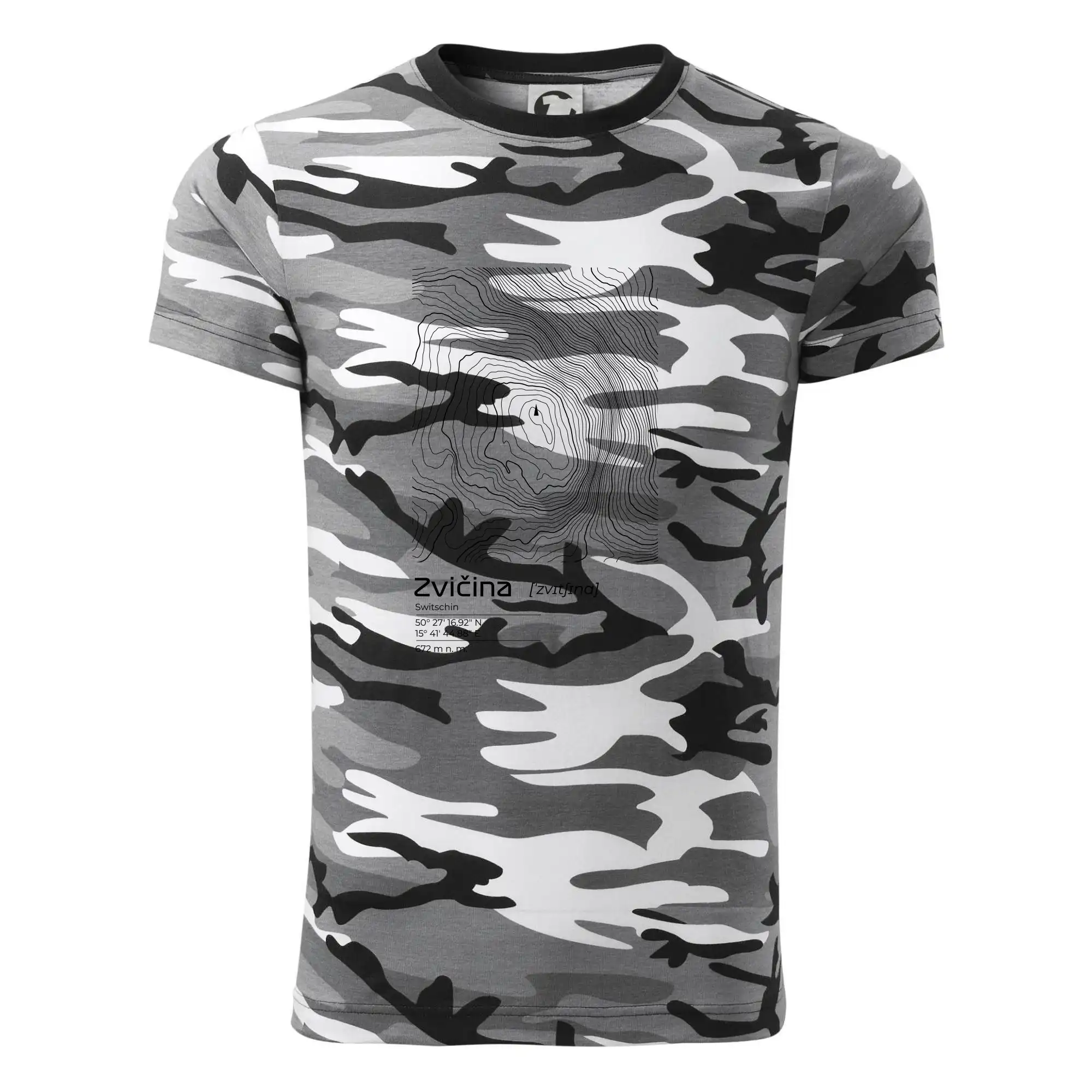 Tričko strednej gramáže vo farbách camouflage. Strih s bočnými švami. Lem priekrčníku z rebrového úpletu s prídavkom 5% elastanu. Vnútorná časť zadného priekrčníka začistená páskou vo farbe camouflage.